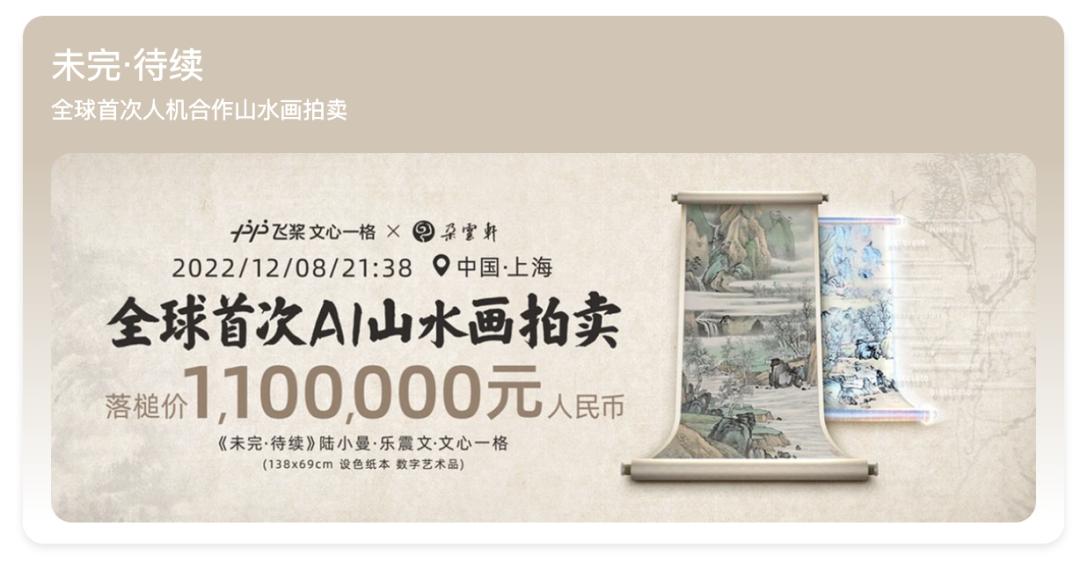 百度推出了AI艺术和创意辅助平台文心一格。在今年7月举办的百度世界大会上,百度用AI复原了中国十大传世名画之一《富春山居图》的残卷。12月8日,百度联同海派画家乐震文补全的AI画作《未完·待续》,拍出了110万元人民币的高价。