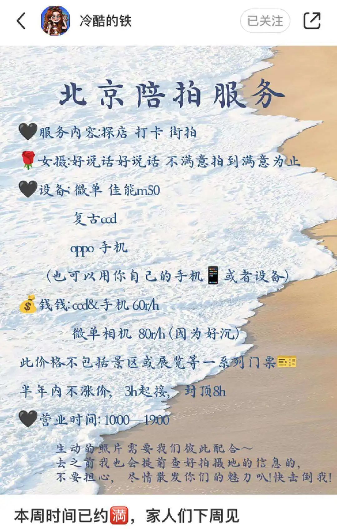 缺一个会拍照、爱拍照、熟知流行拍照模版、审美在线的男朋友/闺蜜。一周前,我的这个痛点居然在刷小红书时解决了,看到一则笔记标题“北京陪拍服务,服务内容为探店打卡街拍”,价格极为诱人——“60R/小时”。