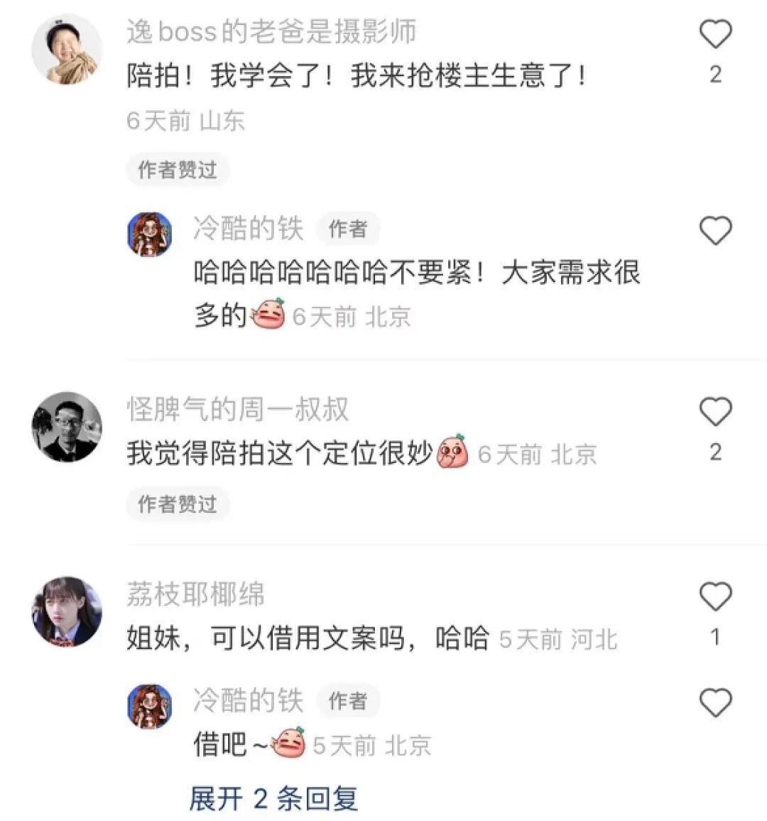 评论区里聚着不少和我一样,第一次在约拍、跟拍、寄拍外听说“陪拍”的网友。新鲜讶异之余,有人想成为客户,有人想竞争同行。