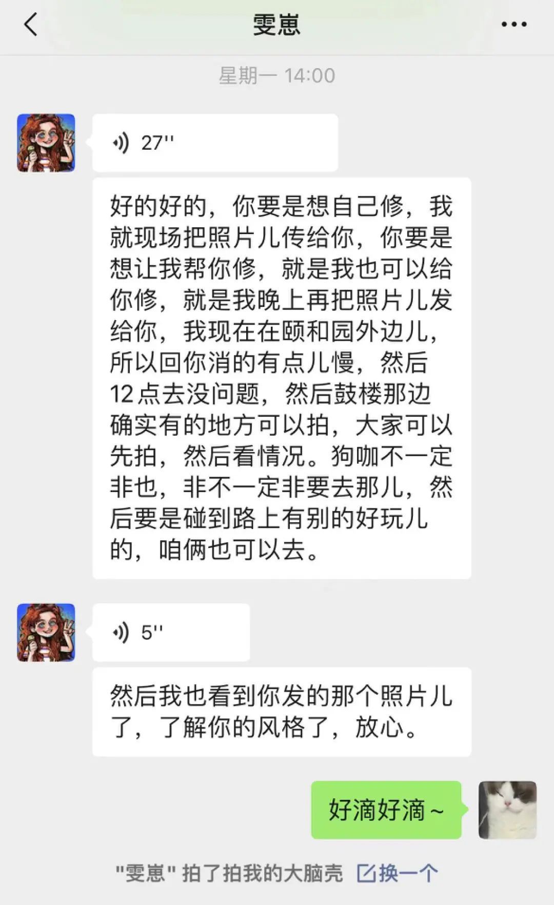 我点开雯仔的头像框私聊,问她是否愿意陪我去拍一些动物合影。她欣然答应,向我了解预期和计划细节后,还给出了些选址和路线上的建议。