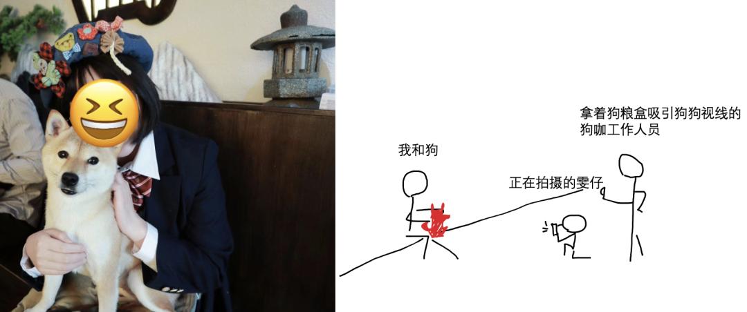 其实这算是她第一次拍人和动物的合影,全靠前几天在小红书上恶补宠物拍照帖。临时抱佛脚还算有用,同在狗咖的一对闺蜜本来并排坐着用三脚架拍,看到我们的拍摄过程后也嘀咕:“我们要不试下像她们那样拍”。