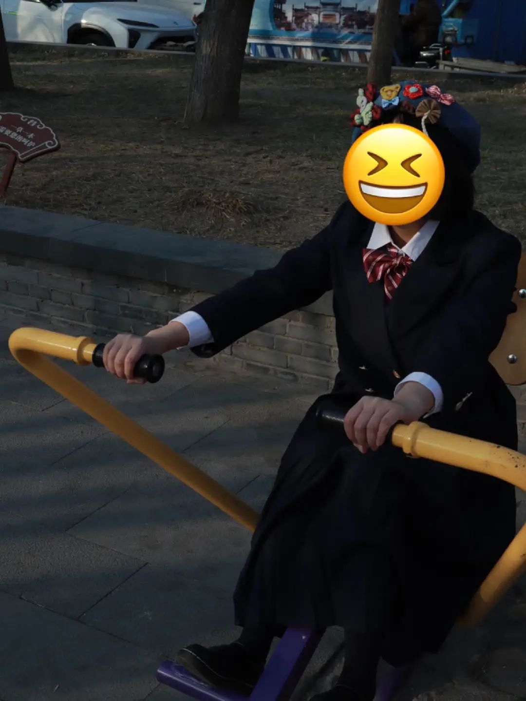 最终在那天我俩灵感枯竭后,她拍出了下面这张实现了和场景道具互动,但很像在开拖拉机,同时表情管理失控的照片。