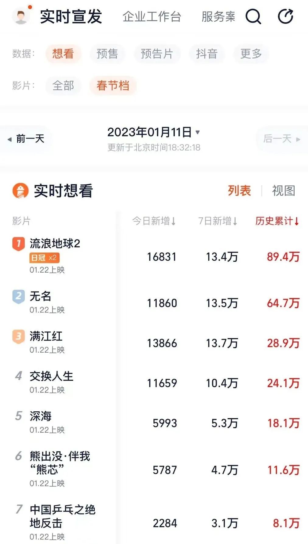 灯塔专业版显示,截至1月11日,想看人数最高的是《流浪地球2》,超过88万人;紧接着是《无名》,想看人数为64万人。这两部影片从热度上看可列在第一梯队。排之后的《满江红》《交换人生》,想看人数均在20万人之上;《深海》和《熊出没·伴我“熊芯”》想看人数在10万~20万人。