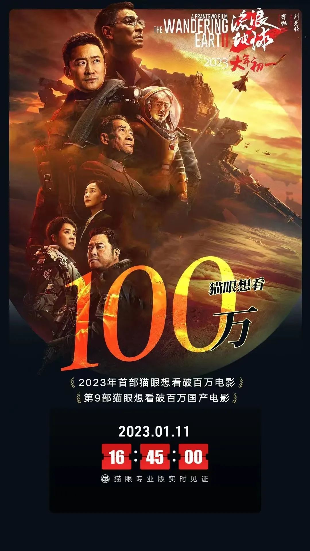 1月11日,《流浪地球2》猫眼想看人数突破100万,成为2023年首部猫眼想看破百万电影。