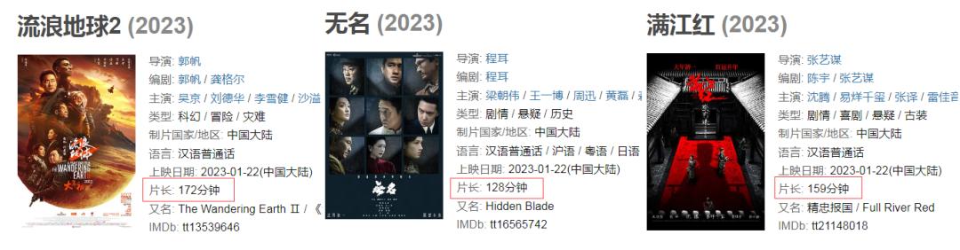 除了对票房的期待,记者还注意到,这个春节档的电影平均时长明显更长。《流浪地球2》《满江红》《无名》时长均超过2小时,《深海》和《交换人生》也都接近两小时,这些档期重要电影,基本都是超长电影片。