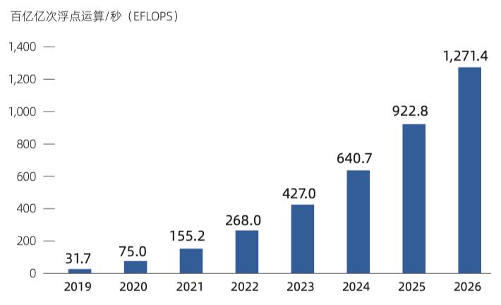 《2022-2023中国人工智能计算力发展评估报告》数据显示,2021年我国智能算力规模达155.2 EFLOPS(FP16),预计到2026年,我国的智能算力规模将达到1,271.4 EFLOPS。