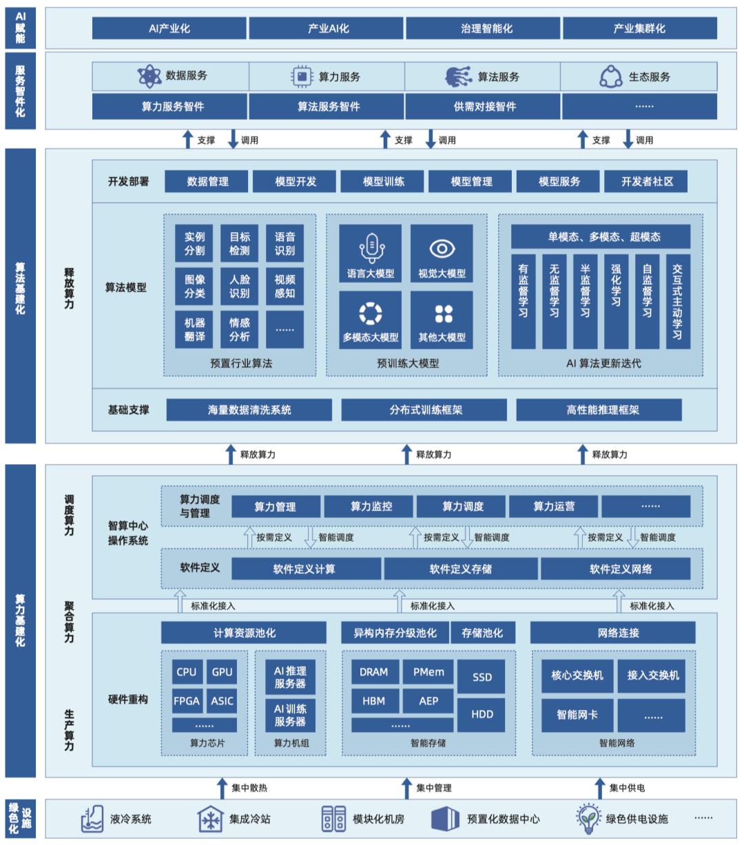 为了能更好地解决人工智能领域的问题,智算中心的发展就需要基于最新的AI论和先进的AI计算架构,并以AI芯片、AI服务器、AI集群为算力的载体。