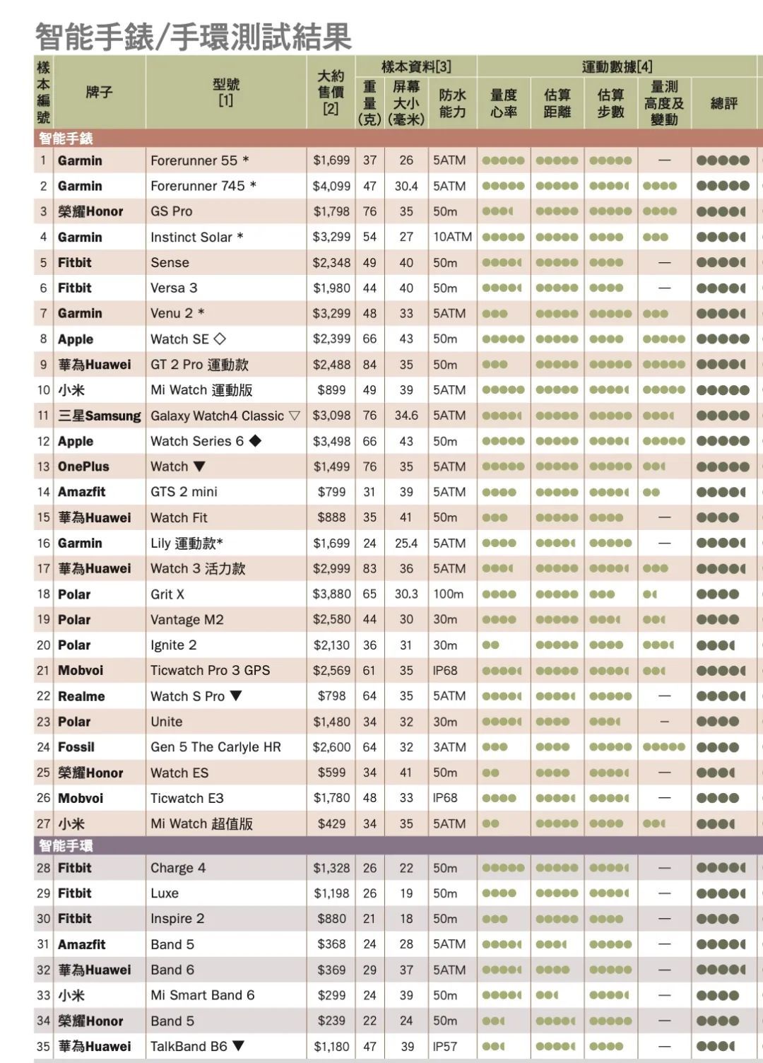 有人帮我们做过更为专业的测评。2021 年底,香港消费者委员会曾挑出三位试用者,佩戴 35 款智能手表(手环)做静态、低强度步行、高强度跑步及踩单车,得到的运动数据与使用精密仪器取得的数据做比较。