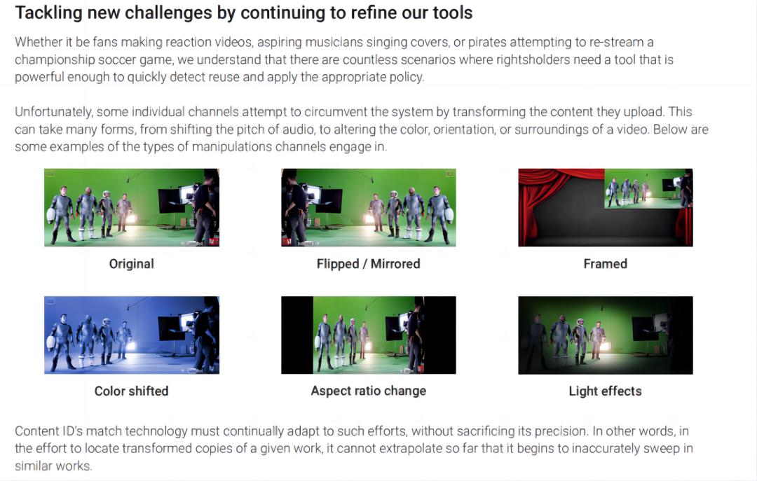 但好在欧洲议会随后也默认,过滤义务更多的是对未来的一种要求和趋势,因为就当前的技术来看,不要说区分meme和侵权内容了,单单识别出侵权内容还是个技术难题。比如在这方面走在前沿的YouTube就在他们的2022年版权报告中诉苦,说他们现在的过滤识别系统还有待改进,因为上传者只需要对侵权视频做一些手脚,比如简单的镜像处理、加边框、改色调或亮度、改比例等操作,就会干扰识别系统对侵权内容的监控准确度。