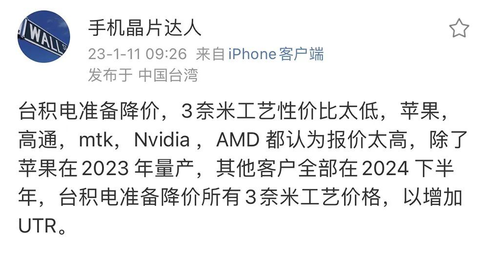另据业内消息人士@手机晶片达人发布的微博内容,台积电准备降低所有3nm工艺价格,苹果、高通、联发科、英伟达、AMD等客户均认为其3nm的报价太高,苹果的将在2023年量产,其他客户的则全部在2024年下半年。