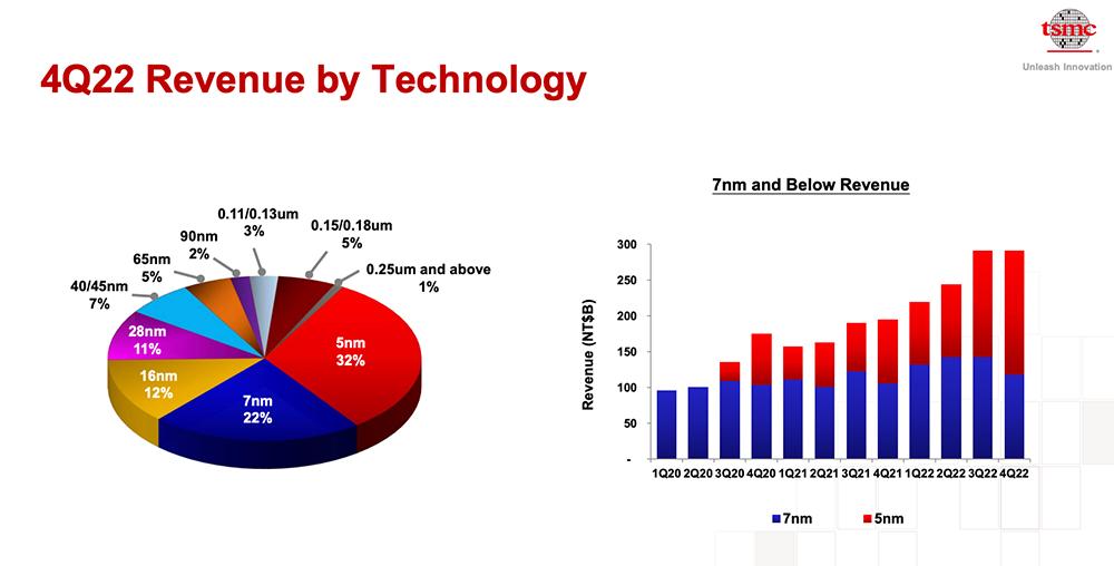 分制程工艺来看,第四季度,台积电5nm和7nm合计收入占比过半,达到54%。其中,5nm占总晶圆收入的32%,7nm占22%。
