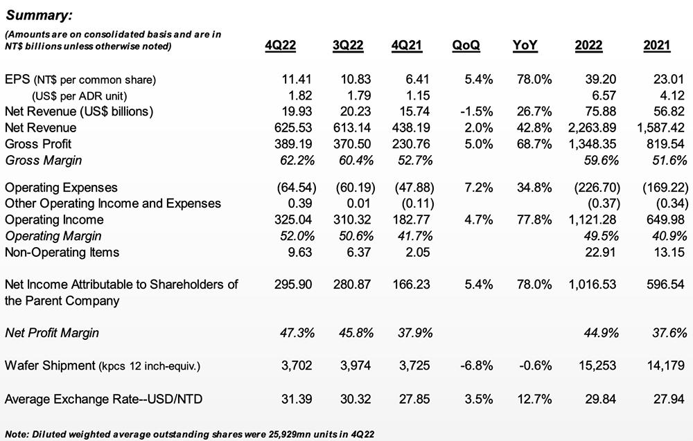 2022财年,台积电全年收入为2.264万亿新台币(758.8亿美元),同比增长42.6%;净利润为1.017万亿新台币,同比增长41.3%;毛利率从2021财年的51.6%涨至59.6%;营业利润率从2021财年的40.9%涨至49.5%。