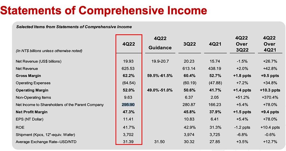 尽管整个芯片产业正被寒气侵袭,但台积电在第四季度的业绩表现依然强劲,收入、净利润、毛利率均创下历史新高。按新台币计,该季度其收入同比增长42.7%,净利润同比大涨78.0%。