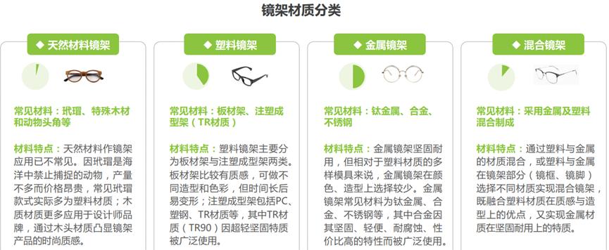镜架方面,基本只有天然材料、塑料、金属、混合镜架四种选择,且装饰性大于功能性,受流行趋势影响,目前塑料与金属更主流,且年轻人更偏爱钛金属,板材材质也有一定的回归迹象。