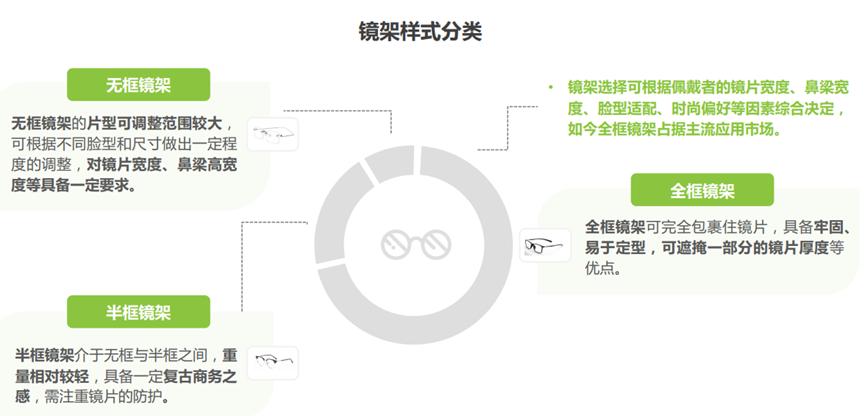 - 其次是有无框架。主要指隐形眼镜与框架眼镜,因为两者用到的材料、生产模具有本质区别,而且适用于不同场合(例如隐形更多用于拍证件照、出席重要仪式等,框架佩戴更日常)、不同人群(隐形适合天然瞳孔大的人群,框架可以更好修饰眼小/圆脸等特定脸型),这也带来了定价差异;