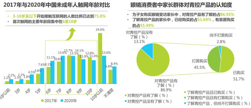 疫情以来暴露的新问题是,网课时间增多以及网民整体触网时间变长,让成年以前的人群更早戴上眼镜,让刚成年不久的人群视力度数加深。例如,疫情期间,为子女购买眼镜的父母对青控产品认知超86%,超半数家长已购买青控产品。