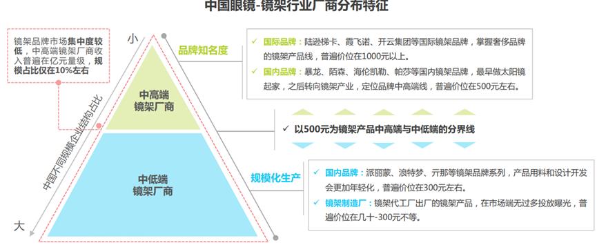 在中国配一副眼镜,低至几十元,高至上千元,主要取决于镜片与镜架各自选择国产还是国际品牌。这是因为中国从事眼镜相关的企业更多集中在附加值较低的中游加工环节,例如中国有四大眼镜生产基地:江苏丹阳、广东深圳、福建厦门、浙江温州,但缺乏对上游原材料供给(包括树脂、玻璃、塑料等镜片原材料以及合金、板材等镜架原材料),以及对下游零售环节品牌端的溢价能力。