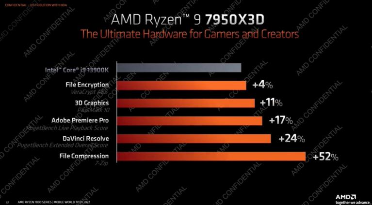 在AMD的数据中,Ryzen9 7950X3D的游戏性能比i9-13900K高出24%,除此之外在Adobe PR、文件压缩等多个测试中都有着不同幅度的领先,其中文件压缩性能的领先更是高达52%。