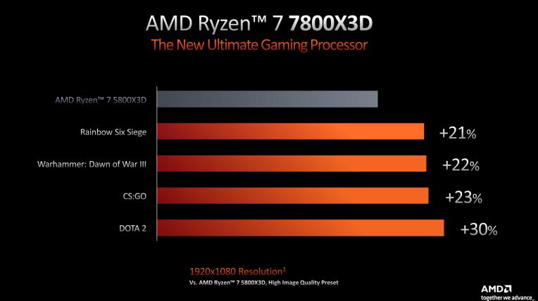 Ryzen7 7800X3D对比的则是Ryzen7 5800X3D,AMD给出的游戏实测结果显示,Ryzen7 7800X3D在《彩虹六号:围攻》《战争黎明3》《CS:GO》《DOTA2》四款游戏中分别有着21%、22%、23%、24%的帧数提升。