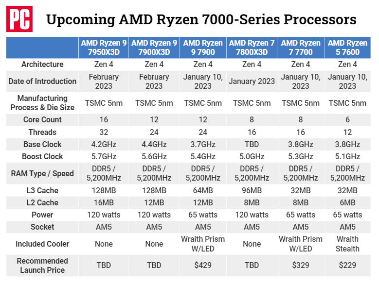 先来看看Ryzen 7000 3D缓存版的规格,AMD此次发布的3D缓存版处理器一共三款,分别是Ryzen9 7950X3D、Ryzen9 7900X3D和Ryzen7 7800X3D,对比上一代新增了两个型号,规格如下: