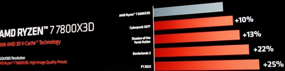 除了对战游戏的数据外,AMD还给出了一些3A大作的数据,分别是《赛博朋克2077》10%、《古墓丽影:暗影》13%、《无主之地3》22%和《F1 2022》25%,可以看到提升的幅度并不算小,特别是一些对显卡性能要求不高的游戏,3D缓存可以让他们的帧数得到巨大提升。
