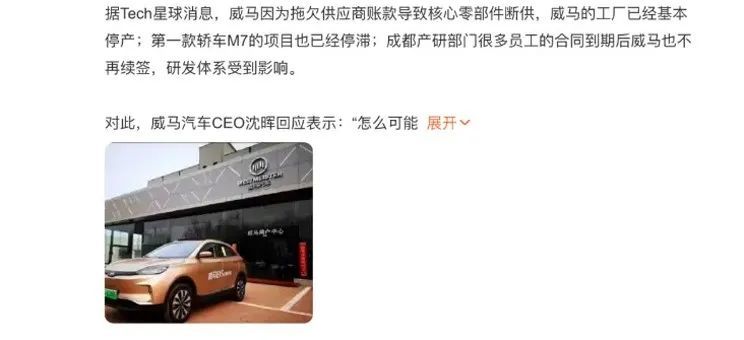 与此同时,一条条对威马不利的传言开始发酵。有人说威马因拖欠供应商账款导致工厂停产,有人说因为没钱与员工续签合同导致威马研发体系分崩离析;还有人说因为缺乏资金支持,威马全新轿车项目陷入停滞……在传言之外可以确认的是,威马确实陷入了财务危机。11月,一封名为《和衷共济,共渡难关》的威马汽车内部信被曝光,其中表示自2022年10月起,威马汽车M4及以上级别管理者主动降薪,发放50%的基本工资,其他员工发放70%的基本工资,公司发薪日由次月8日调整为次月25日,2022年度不再发放额外奖金、留任奖金及年终奖,暂停发放购车补贴。