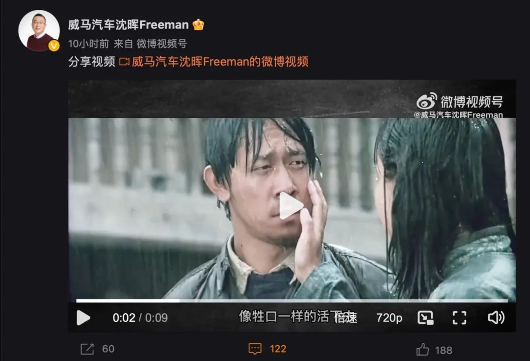 “活下去,像牲口一样的活下去。”这是电影《芙蓉镇》中的一句台词,1月12日下午,威马汽车创始人、董事长兼CEO沈晖将这个片段转发到了微博上,意味深长。