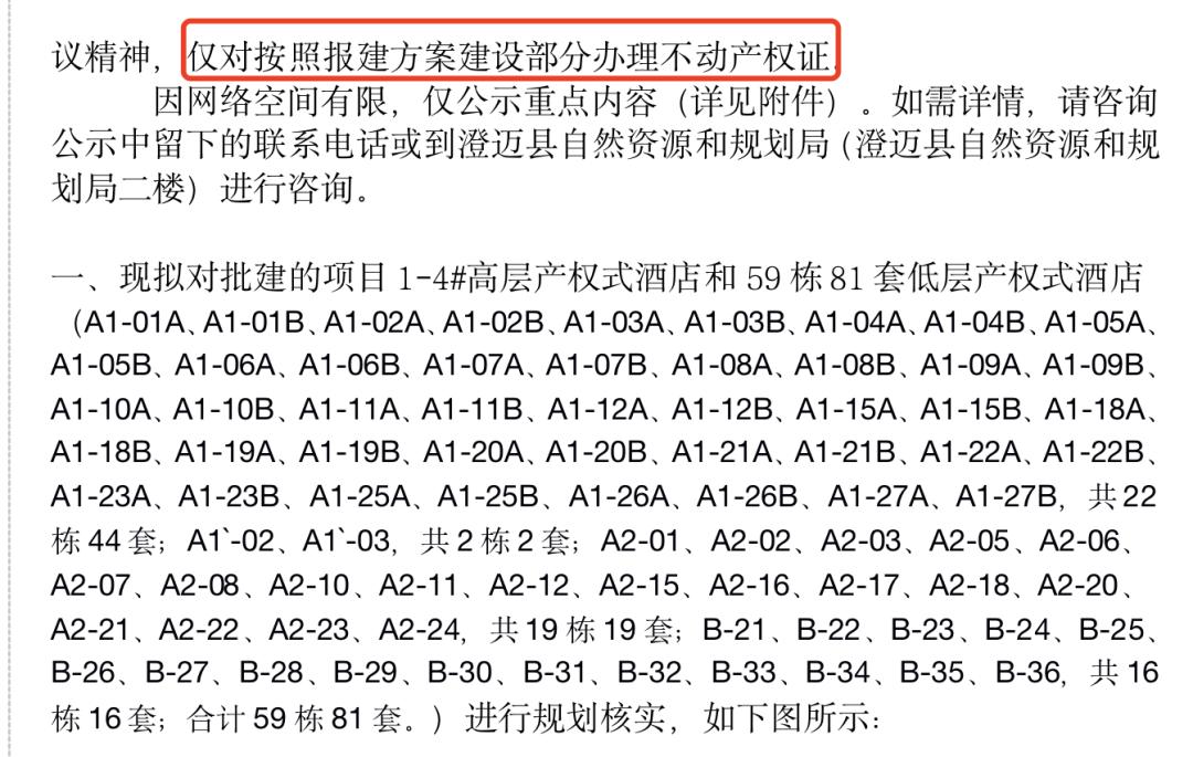 澄迈县自然资源和规划局此前曾表示,根据有关会议精神,仅对按照报建方案建设部分办理不动产权证。