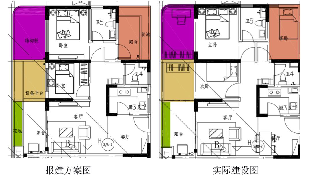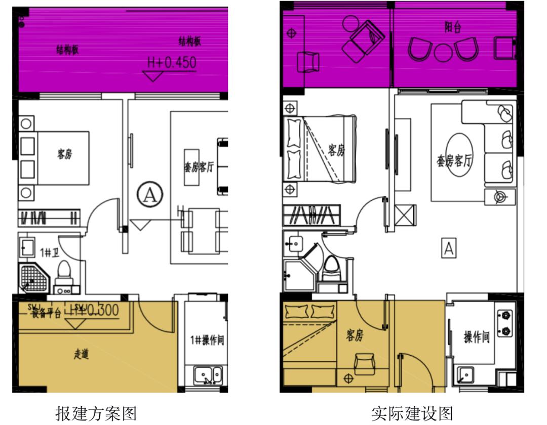 公示内容显示,项目于2017年1月22日取得建设工程规划许可证,2019年2月12日进行变更规划调整。现拟对批建的项目1-4#高层产权式酒店和59栋81套低层产权式酒店进行规划核实,经澄迈县自然资源和规划局与老城开发区管委会投资服务筹备组现场核查,该项目实际与报建存在以下变化:如房屋内、房屋外应建设结构板、设备平台等情况,实际建设为阳台、房间等情况;A1、A1’户型一层应建设门廊,实际建设为客餐厅;二层应建设露台,实际建设为儿童房;三层应建设中空位置,实际建设为露台等等。
