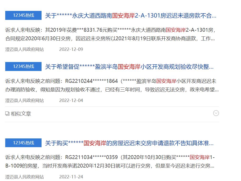 记者在海南12345平台发现,不少业主在平台投诉国安海岸迟迟未交房,有业主的购房合同为2021年12月31日交房,但到去年10月仍未交付。
