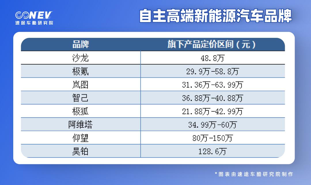 行业内,目前,自主高端新能源品牌聚集了沙龙(长城)、极氪(吉利)、岚图(东风)、智己(上汽)、极狐(北汽)、阿维塔(长安)、仰望(比亚迪)、昊铂(广汽)等。新能源汽车高端市场进入“百花齐放”时代。