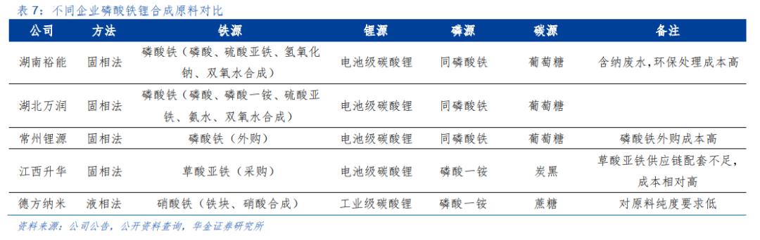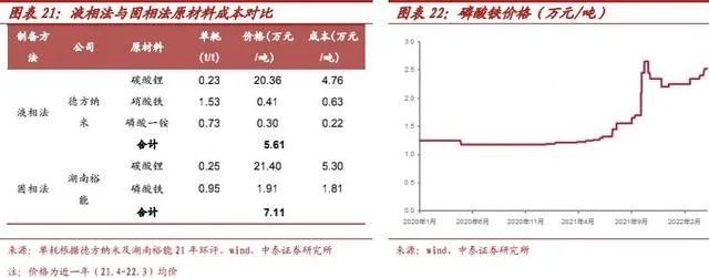 固相法与液相法磷源相同,都使用碳酸锂;铁源及磷源不同,液相法使用硝酸铁作为铁源,磷酸一铵作为磷源,而固相法使用磷酸铁,目前磷酸铁价格维持高位,公司液相法有成本优势。