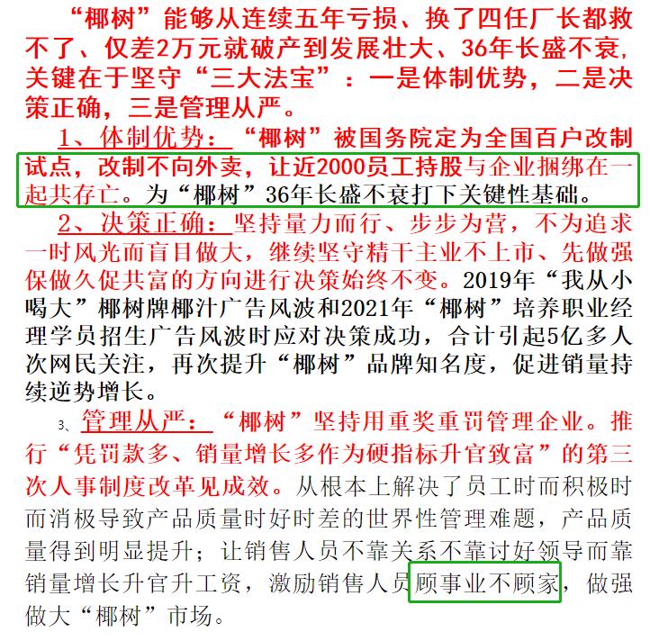 这也是为什么椰树敢在21世纪喊出一句“让近2000员工持股与企业捆绑在一起共存亡”,乍听仿佛是当年的革命话语。