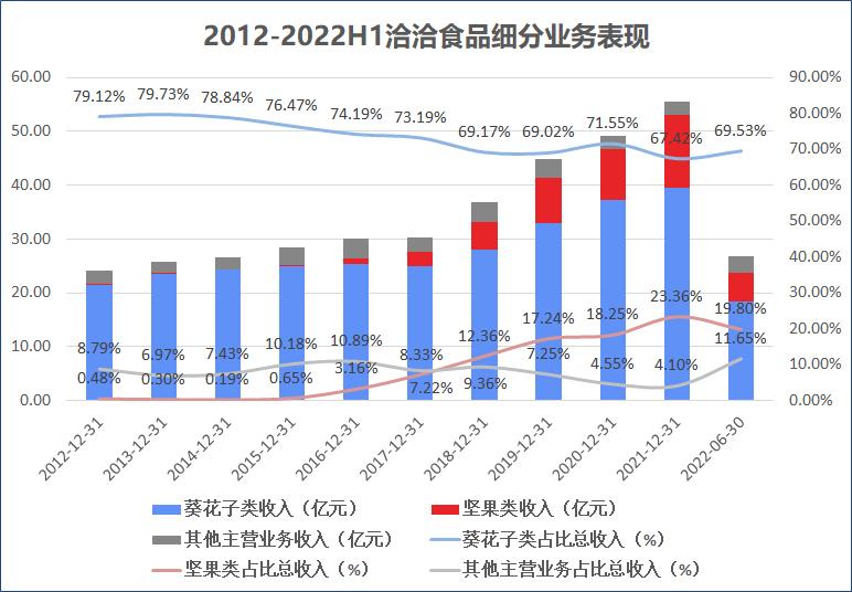 就具体业务来看,洽洽食品目前主营业务为葵花子类、坚果类和其他产品。