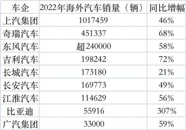 上汽集团之外,奇瑞汽车、东风汽车等车企海外销量也分别超过45万辆、24万辆,同比增幅在60%上下。此外,吉利汽车、长安汽车、江淮汽车等品牌海外销量也超过10万辆,同比均有不同程度的增长。在前述企业中,比亚迪2022年海外汽车销量同比增幅最高,达307%,全年海外销量增至55916辆。