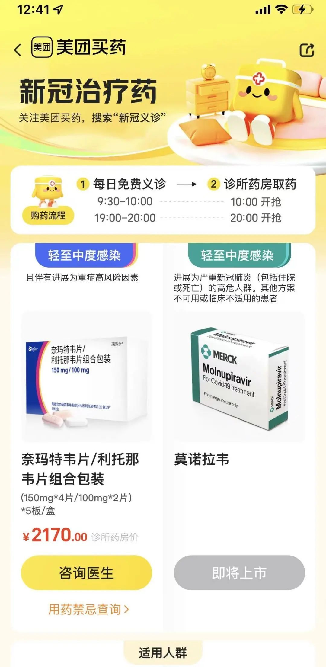 不少网友总结了各大网络平台的买药指南,方便有需要的人“蹲点”:如天猫买药每日10点限量供应布洛芬、对乙酰氨基酚、奈玛特韦/利托那韦(Paxlovid)等用于新冠治疗和症状缓解的药物;美团每天开通两个时段的免费义诊,早上9点半至10点,晚上7点至8点,在这期间Paxlovid限量供应;京东健康每天晚上8点限量开售Paxlovid以及阿兹夫定。