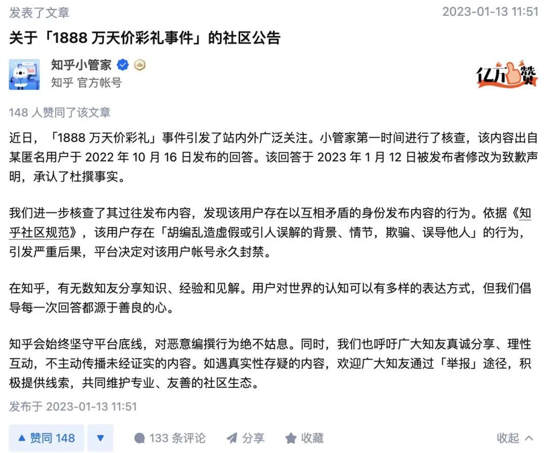 官方账号知乎小管家则在公告中表示它们已第一时间进行了核查:「发现该用户存在以互相矛盾的身份发布内容的行为。依据《知乎社区规范》,该用户存在『胡编乱造虚假或引人误解的背景、情节,欺骗、误导他人』的行为,引发严重后果,平台决定对该用户帐号永久封禁。」