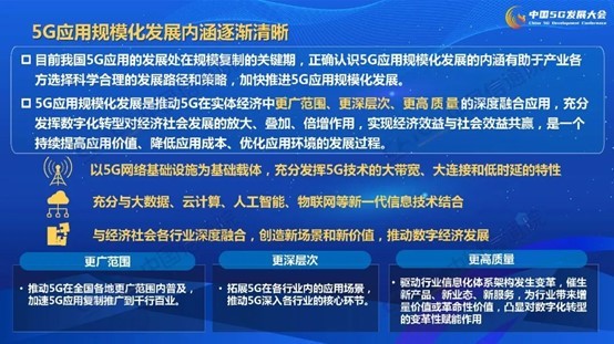5G应用规模化发展内涵不断清晰。5G应用规模化发展是推动5G在实体经济中更广范围、更深层次、更高质量的深度融合应用,充分发挥数字化转型对经济社会发展的放大、叠加、倍增作用,实现经济效益与社会效益共赢,是一个持续提高应用价值、降低应用成本、优化应用环境的发展过程。这个过程具有系统性、长期性、复杂性等特征,需要科学地看待其发展历程与规律。