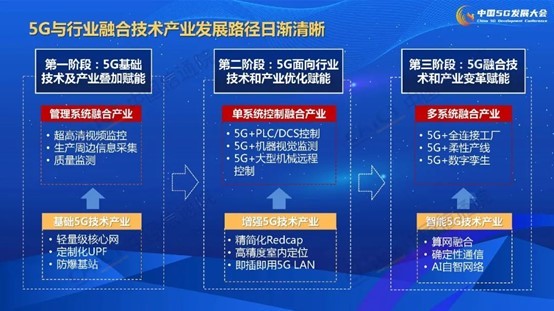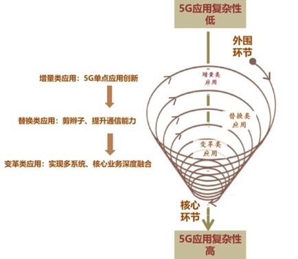 5G应用发展路径逐渐明确。按照复杂性和实施难易程度,5G应用将呈现梯度式纵深推进的发展模式,从增量类应用、到替换类应用、再到变革类应用,逐步实现5G应用从外围环节向企业核心业务环节的纵深拓展。5G行业应用技术产业将逐步由5G基础技术及产业叠加赋能阶段、5G面向行业技术和产业优化赋能阶段最终发展到5G融合技术和产业变革赋能阶段。