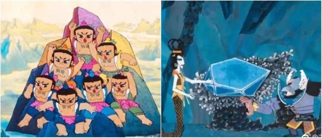 上美影制作的《葫芦兄弟》,原型本是民间传说《十兄弟》,只是受限于成本,原本的“十兄弟”缩水成七个,形象设计上也把七个人都画成一样的,只用颜色区分。反派只留下蛇精和蝎子精,各种华丽的宫殿变成了山洞。