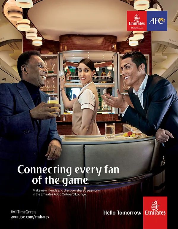 2014巴西世界杯前夕,阿联酋航空聘请球王贝利出任品牌形象大使。在该航空公司的促成下,C罗与贝利共同缔造足坛“世纪同框”的名场面。
