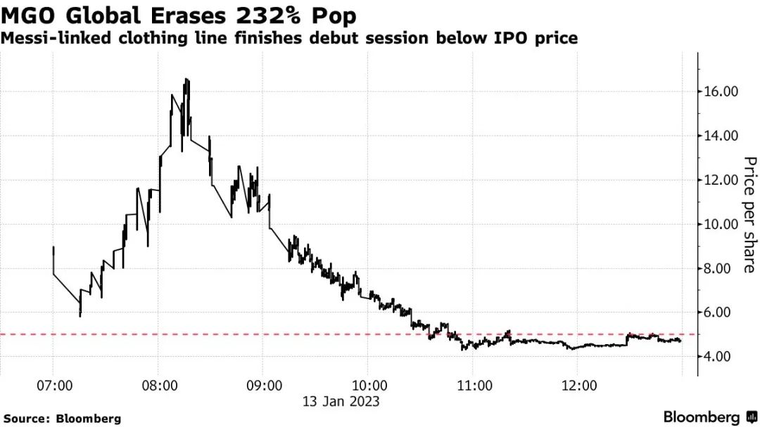 在首个交易日中,MGO Global的股价犹如过山车,前90分钟内飙涨232%,到了下午则完全抹去涨势并跌破5美元的发行价,收盘时下跌7%。该交易日约有1420万股易手。