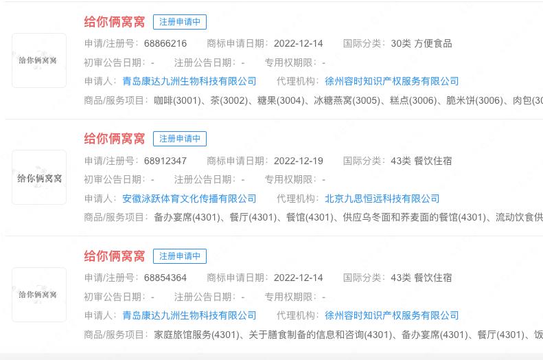 截至目前,“给你俩窝窝”商标已被不同中国公司申请注册,国际分类涉25类服装鞋帽、30类方便食品、43类餐饮住宿等,商品服务范围包括T恤衫、冰糖燕窝、肉包等,目前商标状态均为“注册申请中”。