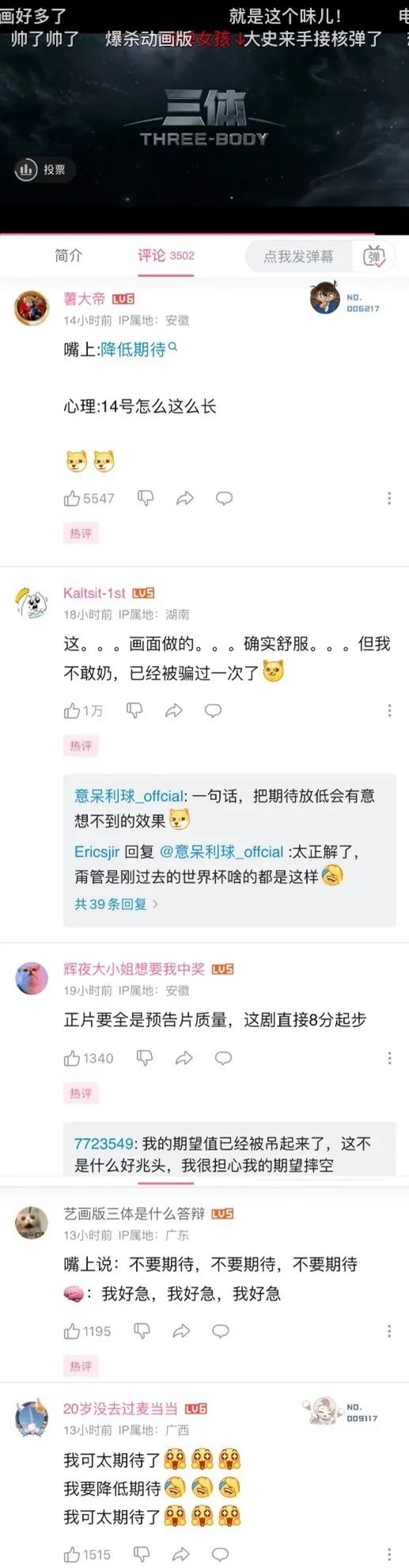 更重要的是,剧版能从观众对于动画的大规模吐槽中提炼痛点和诉求,用于自身剧集调整和完善。从这周放出的几支预告片看,剧版宣传尤其强调了对原著中重要且浓墨重彩,而动画版中却完全缺失的三体游戏世界的呈现。