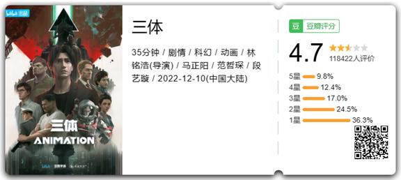 随着本周六(2013年1月14日)第7集播出,《三体》动画版热度居高不下,累计播放3.5亿,703.8万人追番。豆瓣评分由开播时的7分跌至4.7分(满分10分)。