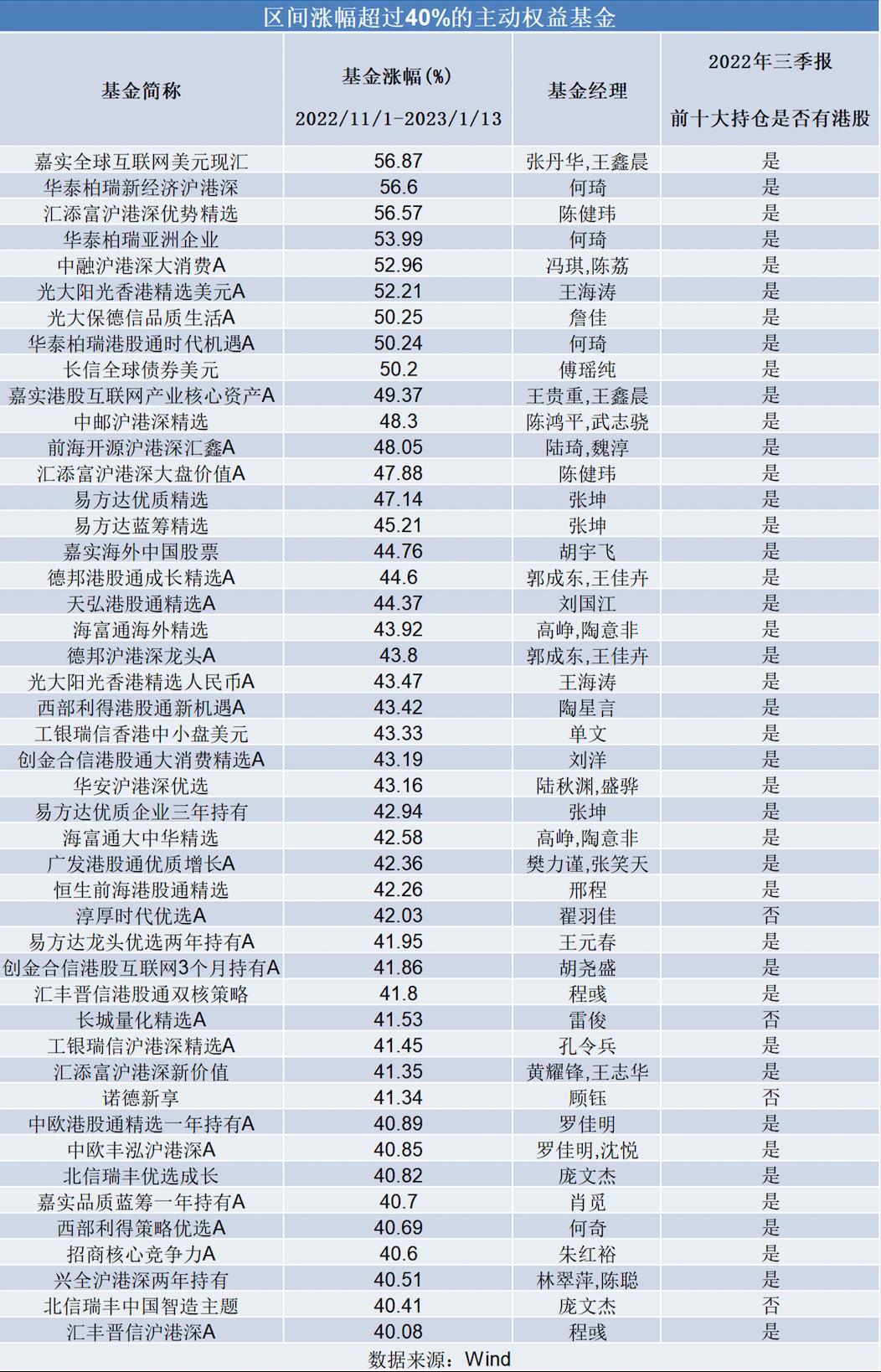 据Wind统计,自2022年11月1日至1月13日,有46只主动权益基金涨幅超过40%(不同份额合并计算)。
