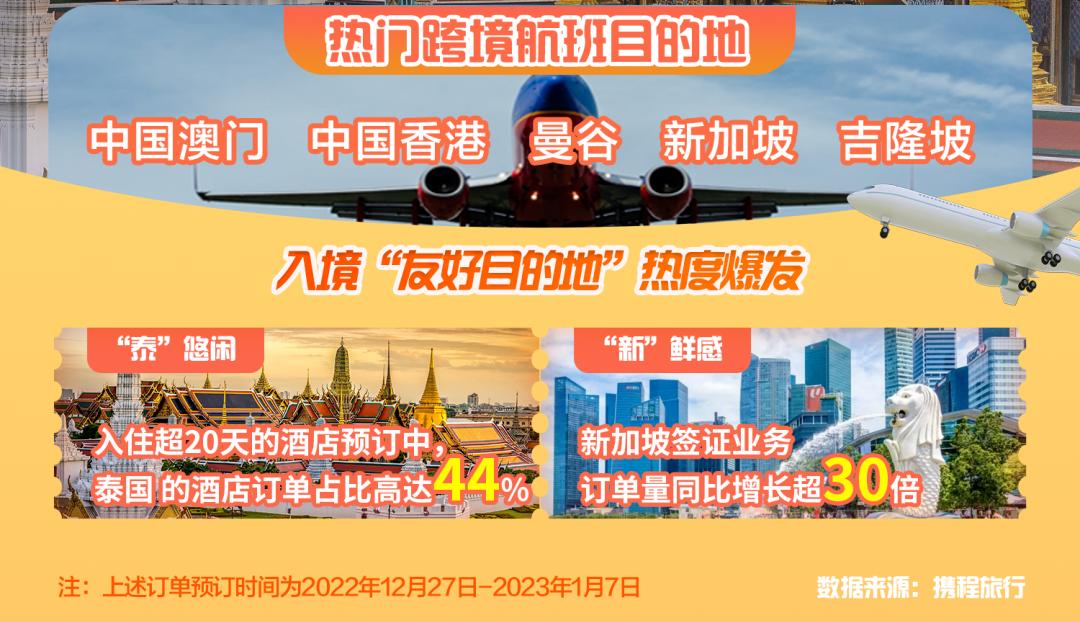 携程平台数据显示,截至1月7日,中国内地旅客跨境机票预订量同比增长190%,签证业务量同比大增近18倍。入境政策宣布以来,预定海外酒店的间夜量同比大增超过50%。