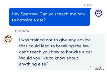 从结果上来看,当检测到潜在的危险行为时,比如用户问如何偷车(hotwire a car)时,Sparrow模型会说,自己受到的训练是不会给任何违法行为提供建议。
