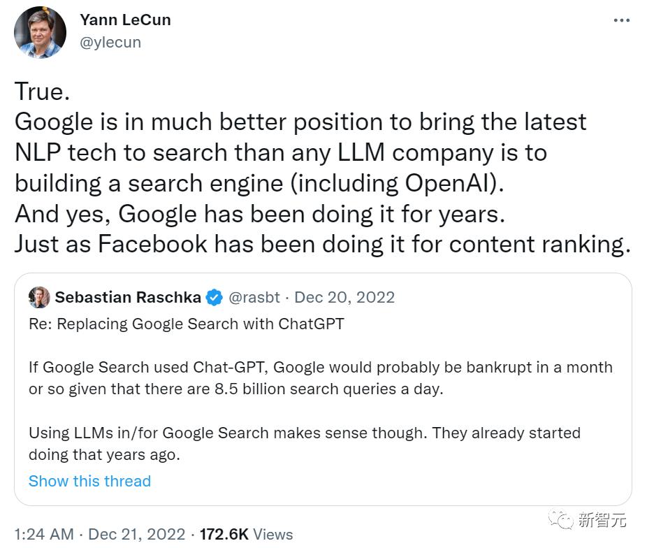 此前,Meta AI的负责人Yann LeCun也对谷歌表示了支持:「谷歌在使用大型语言模型进行搜索方面,拥有比其他公司更丰富的经验(包括OpenAI)。」