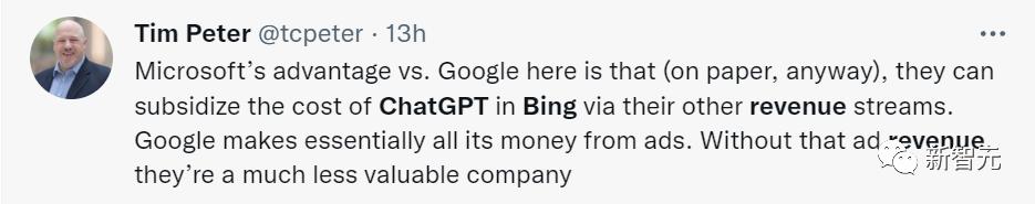 数字营销专家Tim Peter在推特上指出,微软的优势在于可以通过其他收入来源,来补贴必应中ChatGPT的成本